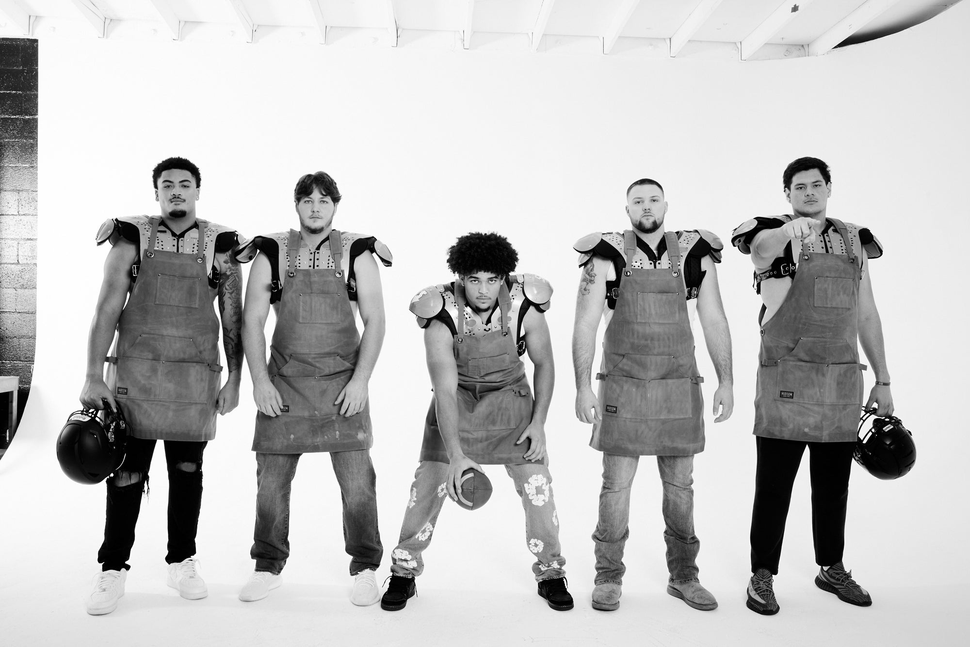 Members of the 2023 Washington Huskies offensive line photographed by Matt Sayles. From left to Right: Nate Kalepo, Zachary Henning, Parker Brailsford, Gaard Memmelaar, Julius Buelow.